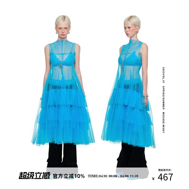1JINN STUDIO 网纱透视层次无袖连衣裙女设计感外塔叠穿蓬蓬裙