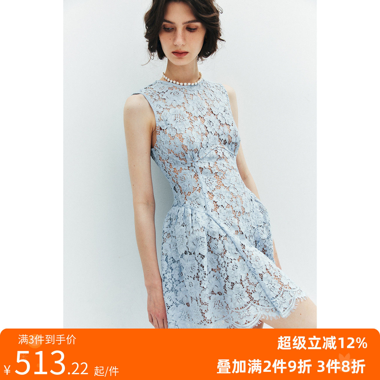 1P STUDIO 白色蕾丝花朵挖肩无袖连衣裙女春夏季高领收腰蓬蓬短裙