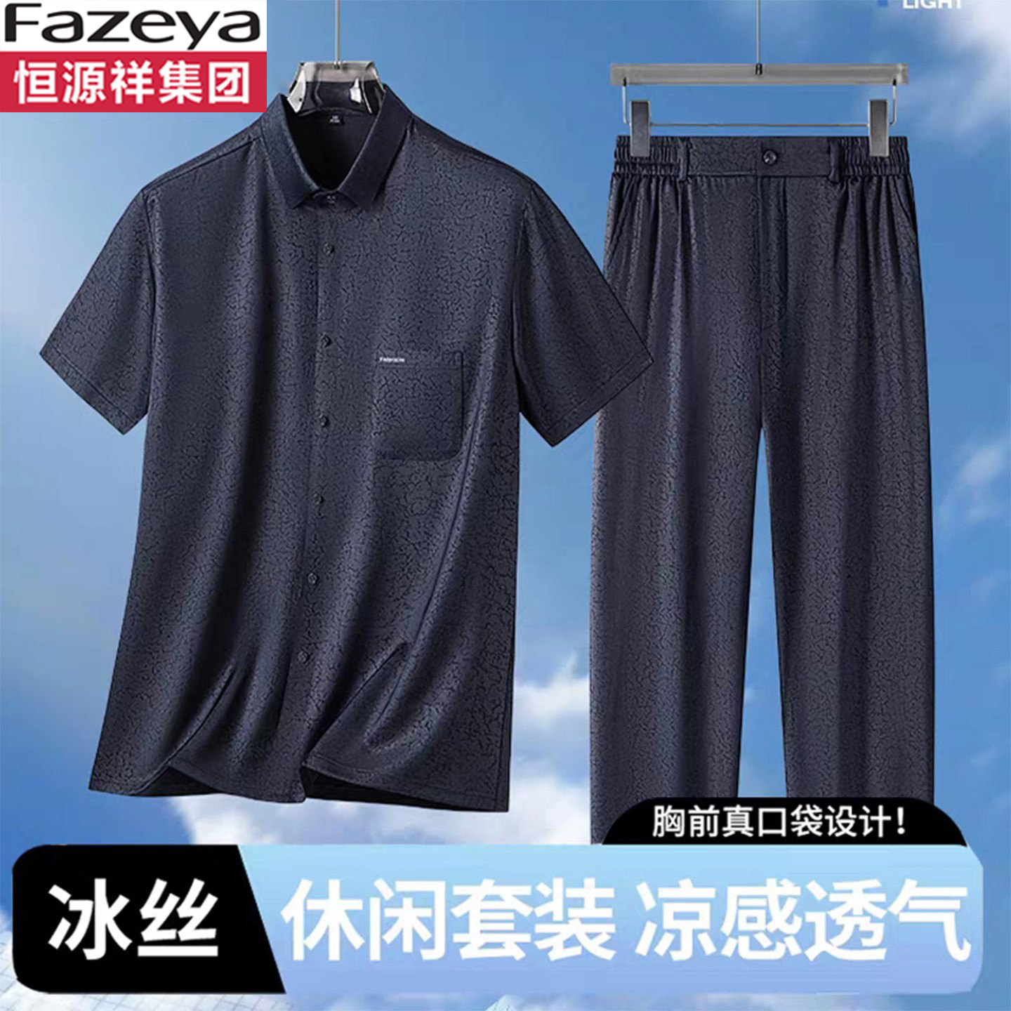 恒源祥集团彩羊夏季商务免烫冰丝衬衫男中老年爸爸装宽松短袖套装