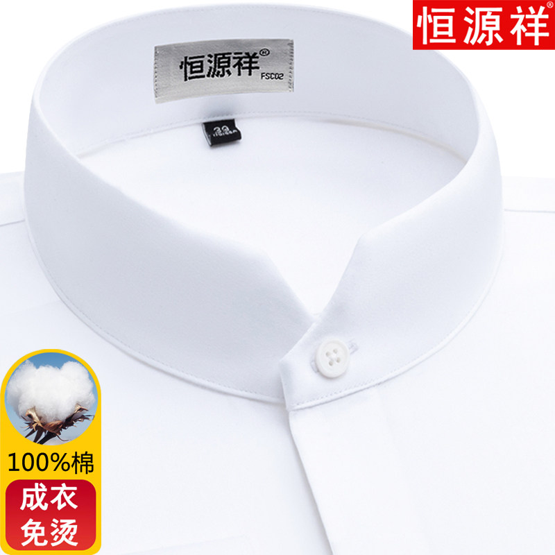 春季款恒源祥立领纯棉长袖衬衫男士纯白色圆领时尚休闲衬衣免烫潮