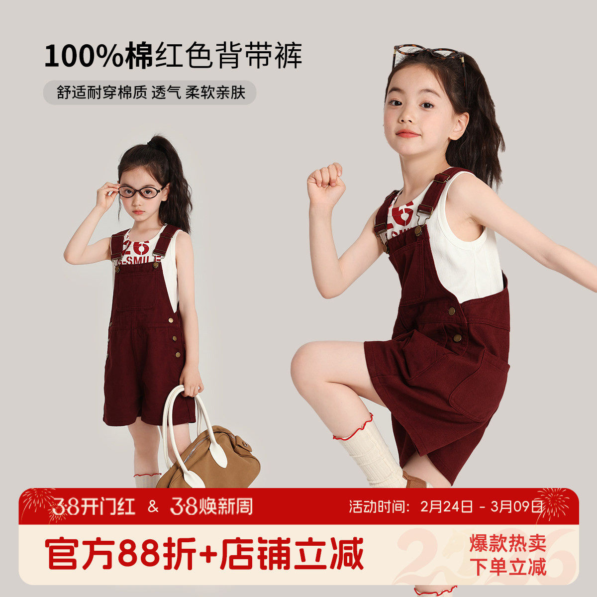 布丁哈鲁童装夏装女童短裤子2026夏季新款儿童纯棉红色背带裤女孩