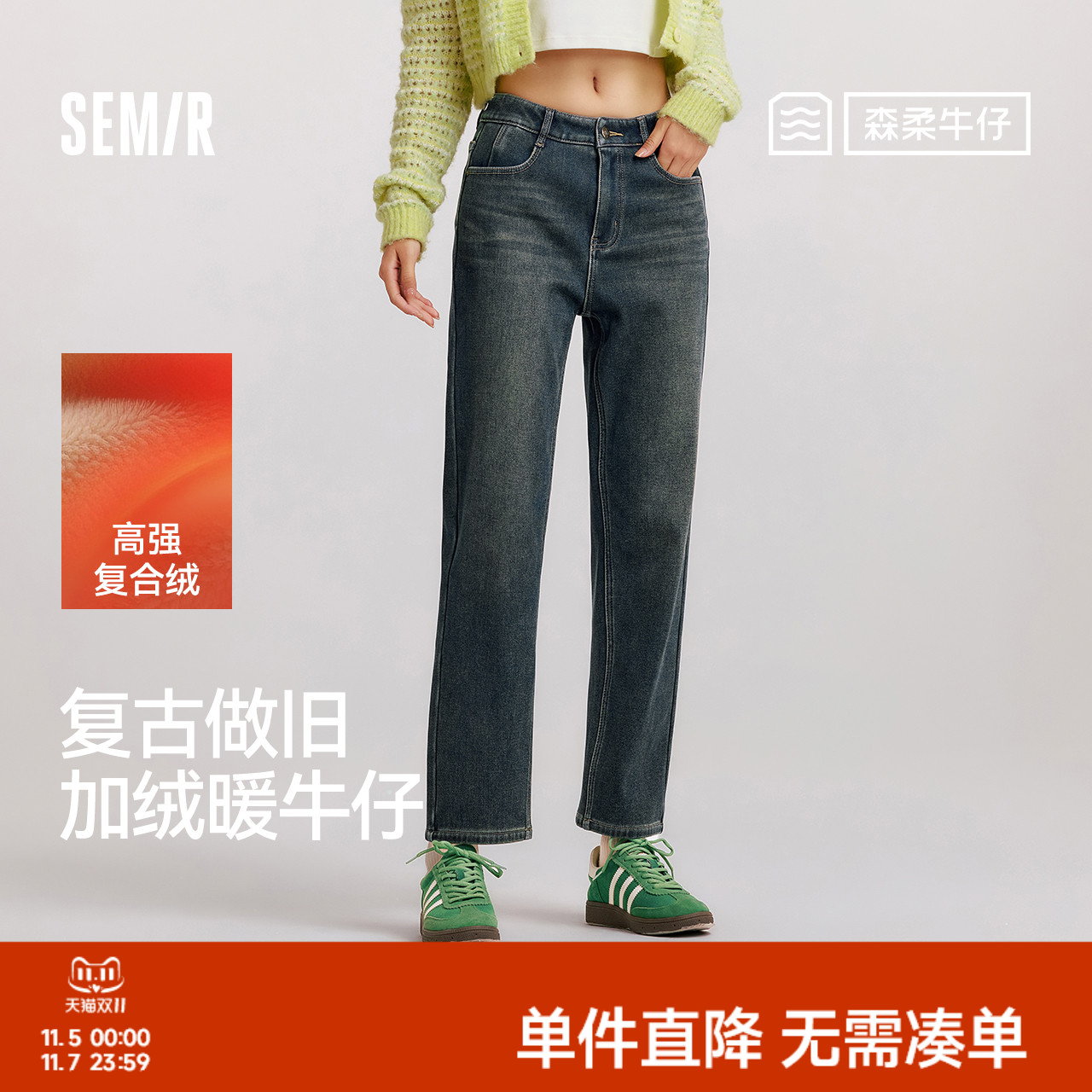 森柔牛仔|森马牛仔裤女抓毛长裤女生冬季半松紧腰直筒裤美式休闲