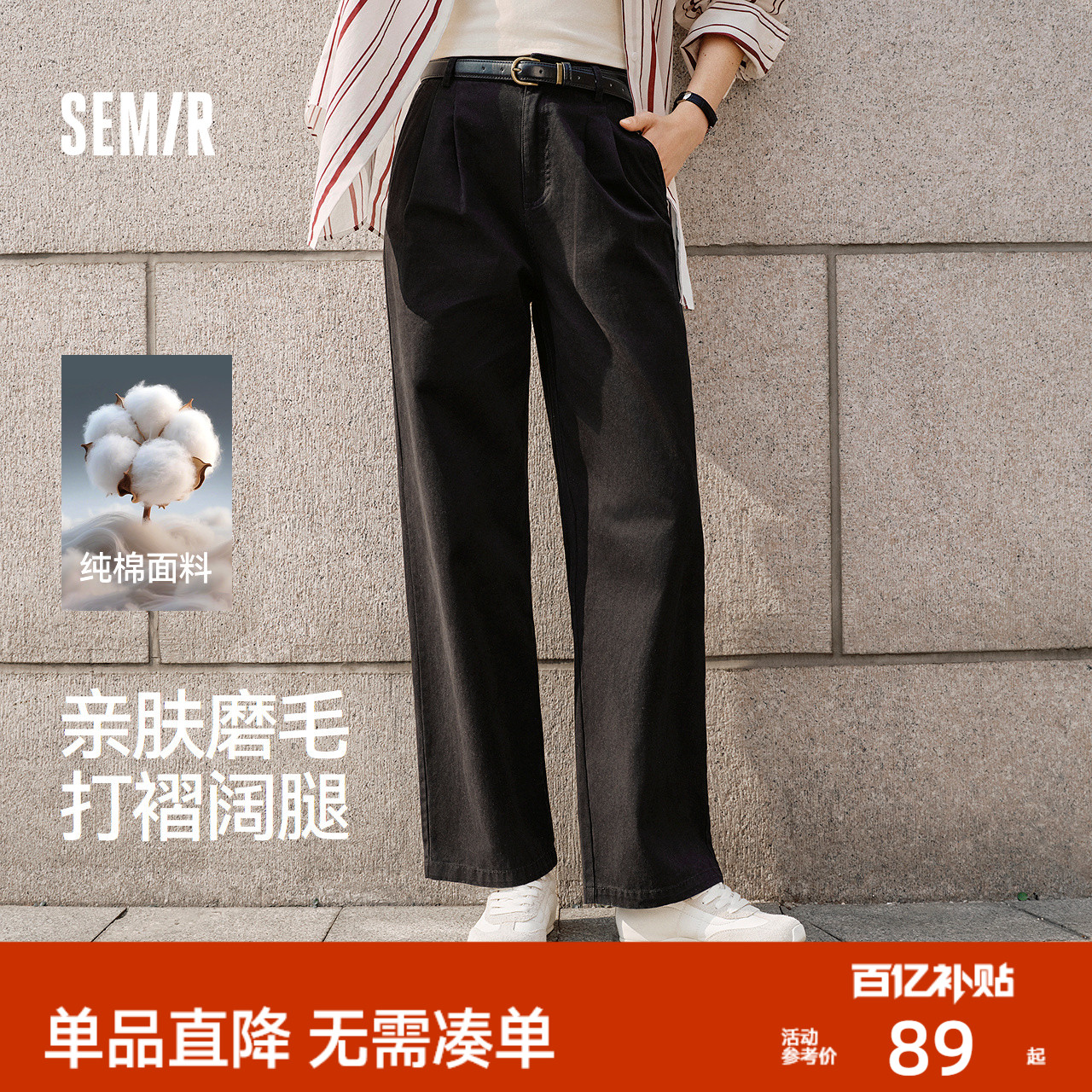 森马牛仔裤女冬抓毛莱赛尔阔腿裤2025新款白色拖地裤蓝色流行高腰