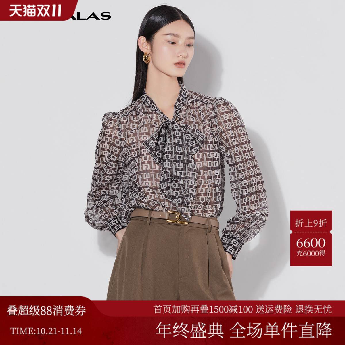 曼德诗雪纺衬衫女2025年夏季洋气时尚设计感飘带长袖印花薄款衬衣