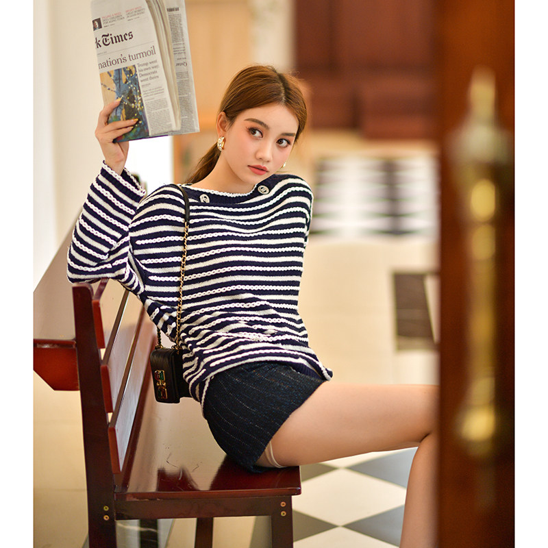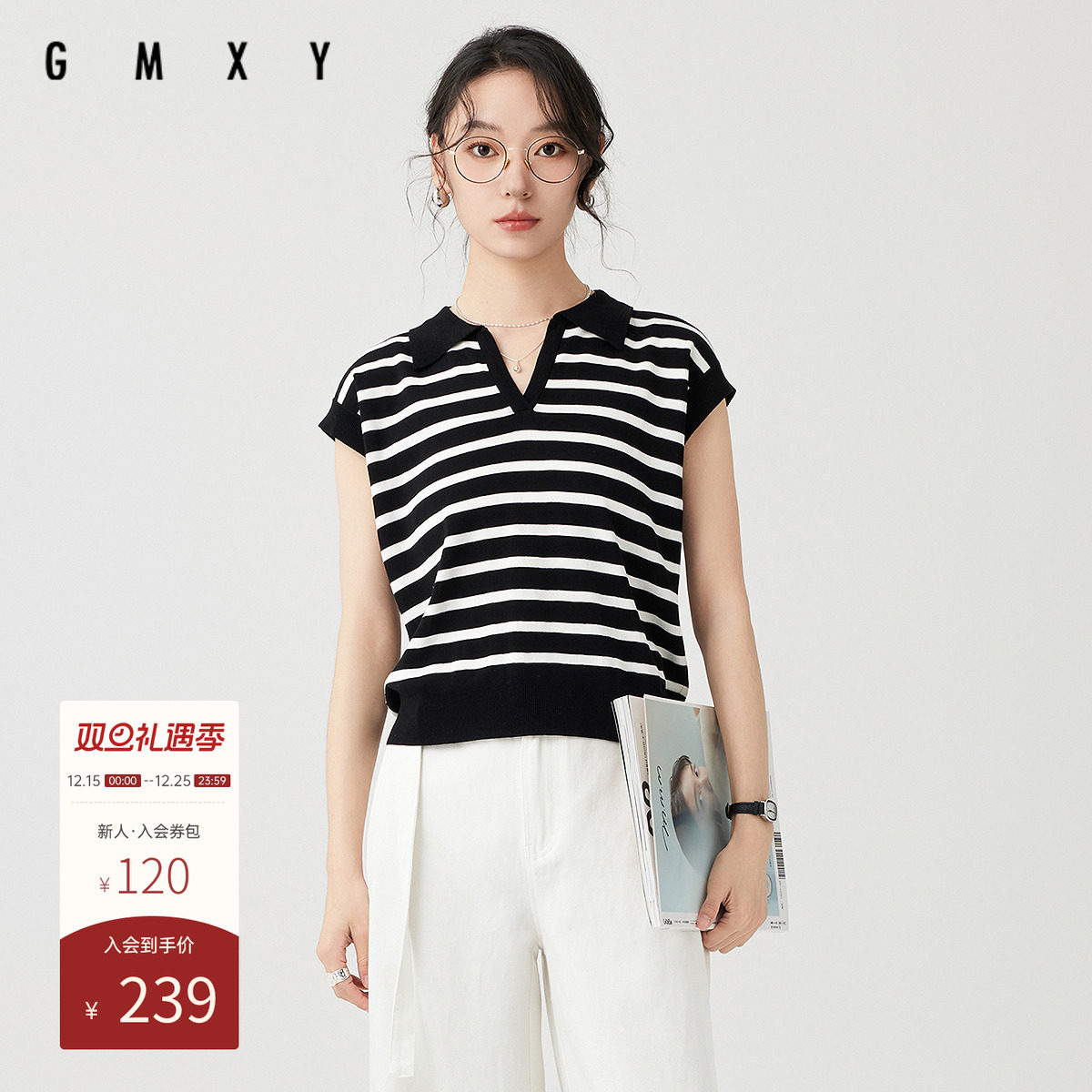 古木夕羊夏季POLO领条纹撞色套头毛衣女显瘦修身上衣GS430034012