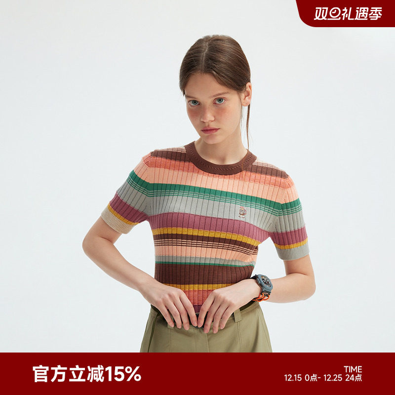 TeenieWeenie小熊女装毛衣2025夏季新款多巴胺条纹圆领短袖针织衫