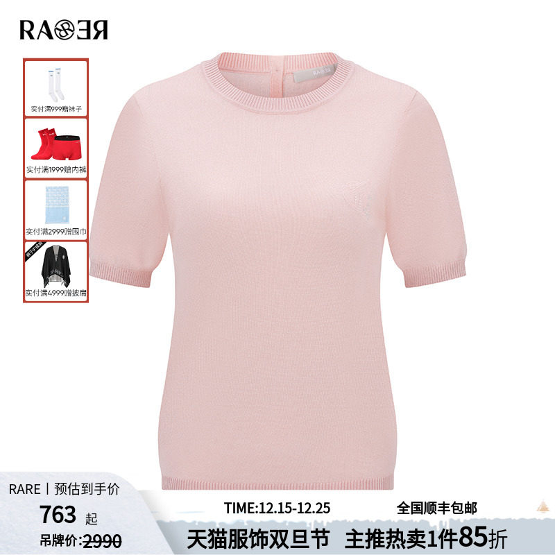 RARE威雅女装夏季新款女士粉色短袖毛衣羊毛混纺透气圆领T恤