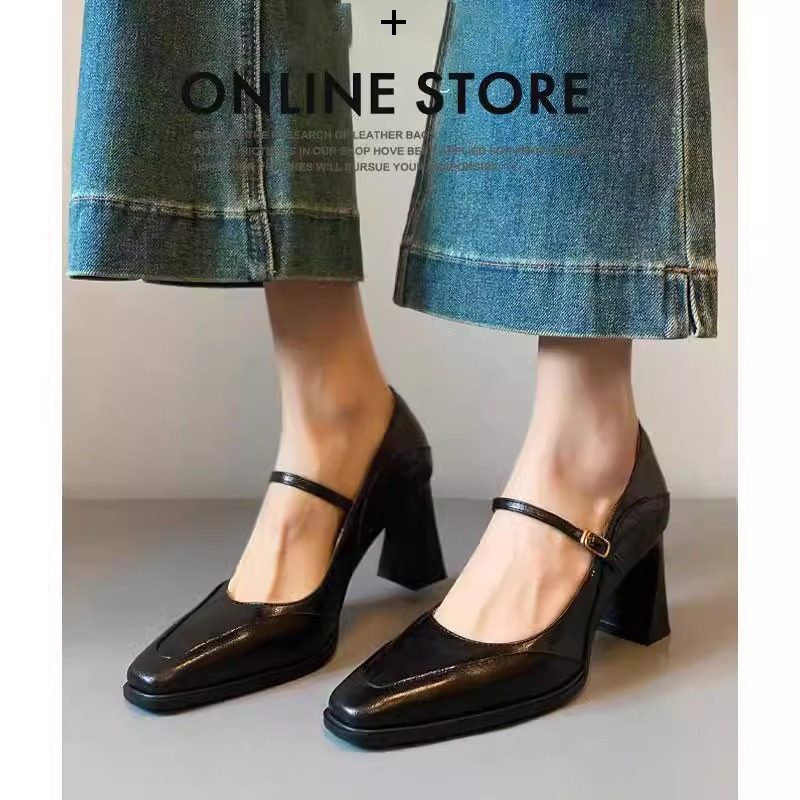 羊皮版~法式气质方头一字扣带高跟鞋女粗跟单鞋女浅口玛丽珍女鞋