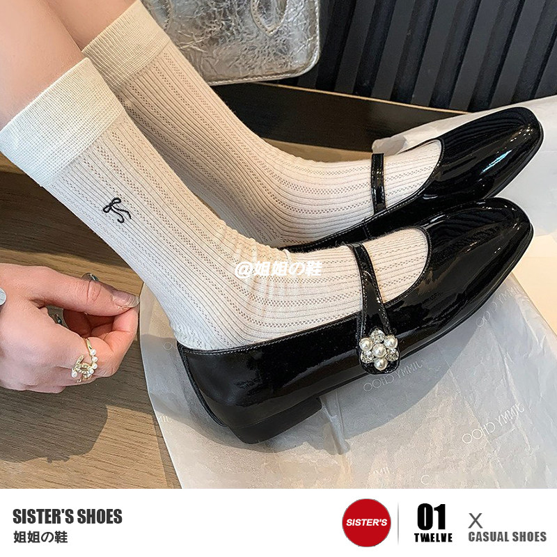 珍珠玛丽珍单鞋女2025新款粗跟方头一字扣法式高跟鞋中跟百搭漆皮