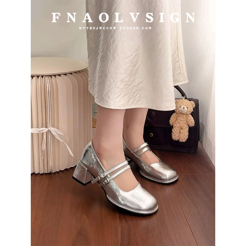 法式银色漆皮水钻玛丽珍鞋2025新款粗跟一字式扣单鞋方头高跟鞋女