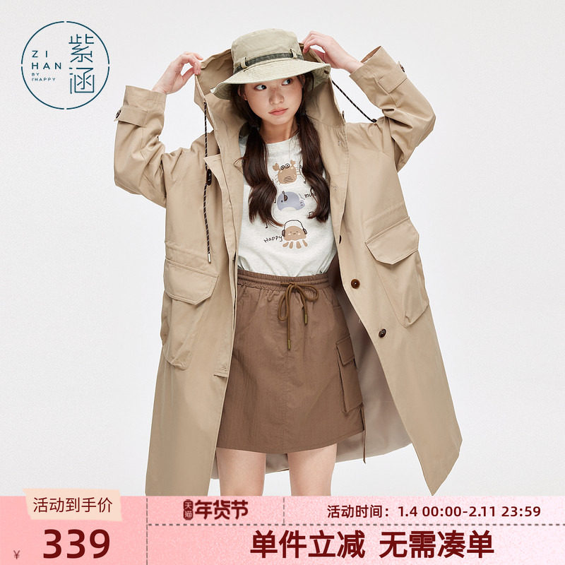 紫涵工装休闲连帽风衣女中长款春秋季新款撞色纽扣简约通勤外套潮