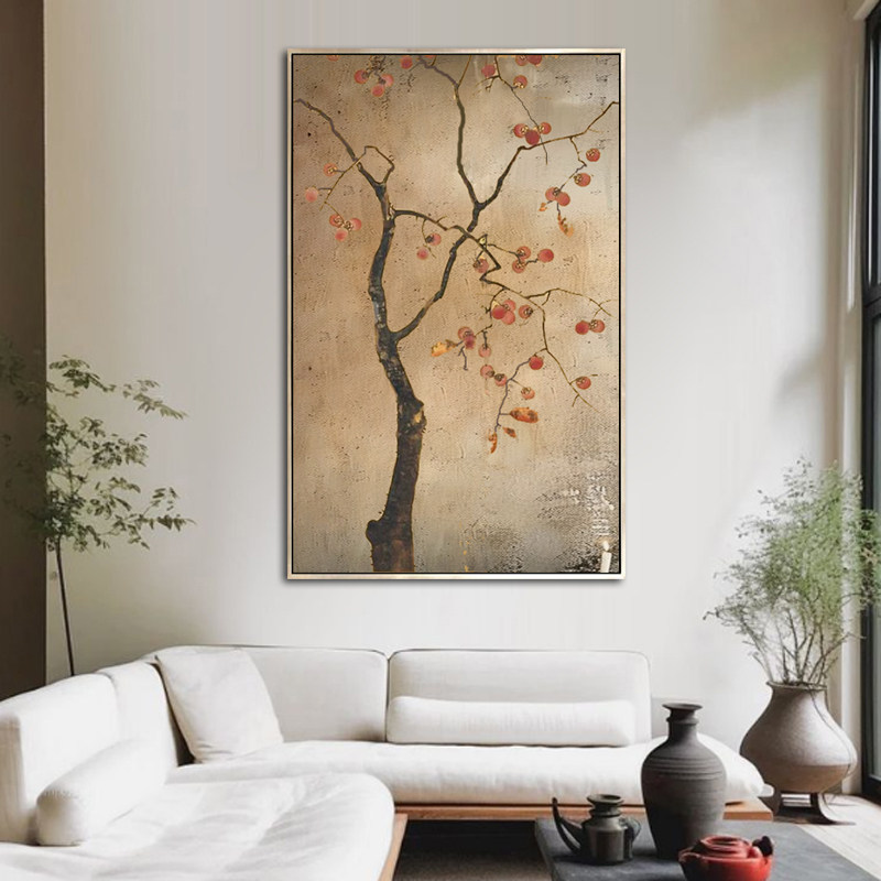 中式手绘装饰画柿子油画事事如意客厅大幅落地画竖玄关挂画办公室