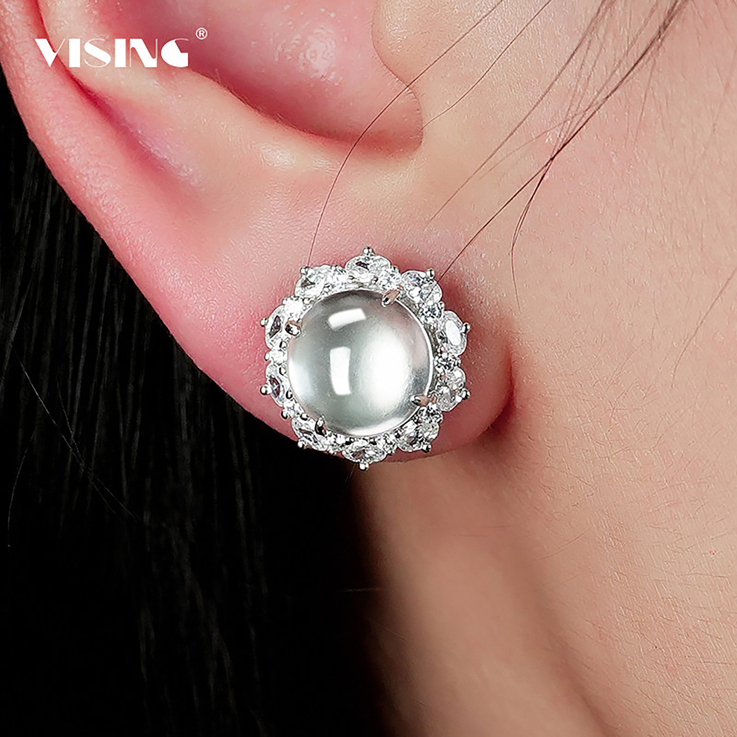 VISING天然玻璃种石英质玉水沫玉白月光小钢炮封底鸽子蛋耳钉
