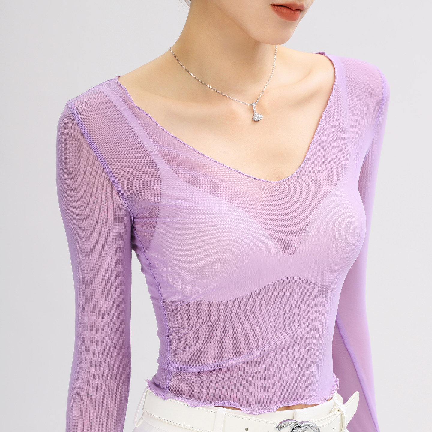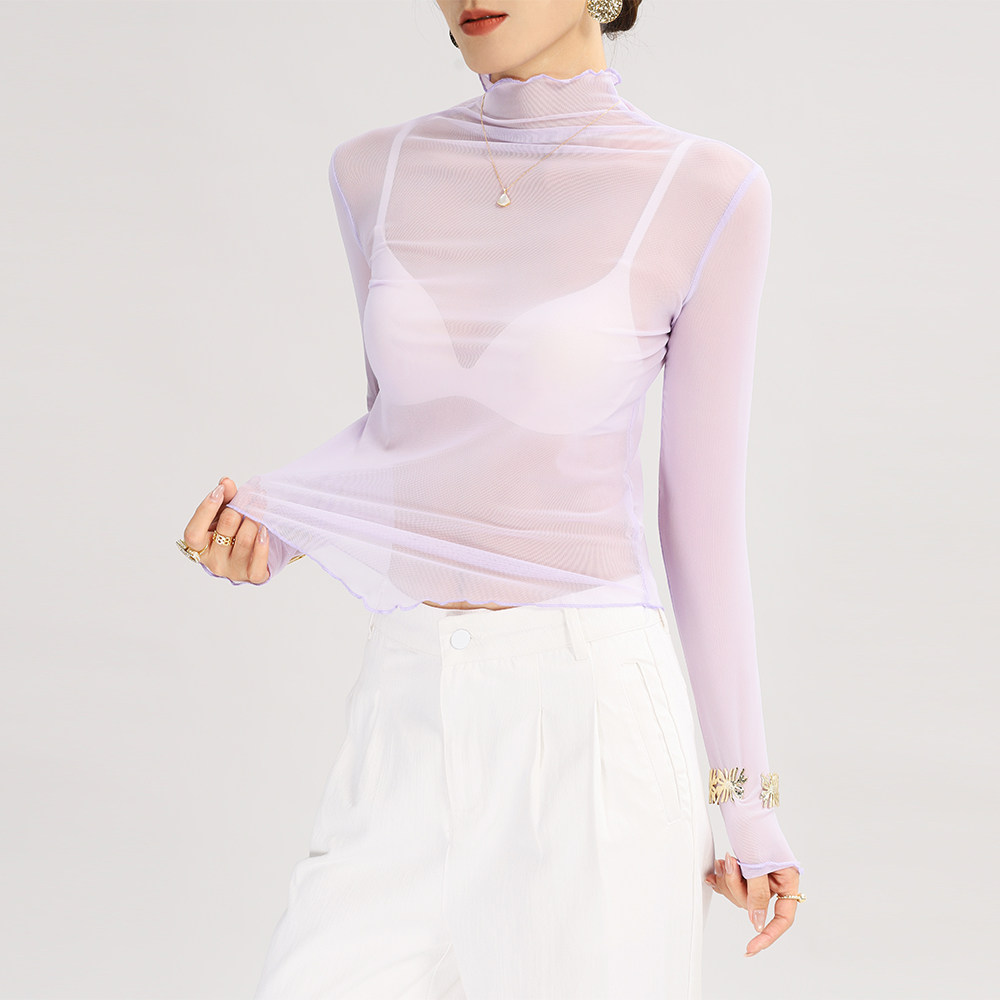 网纱上衣高级感紫色独特漂亮透明蕾丝罩衫超好看高领打底衫女高端