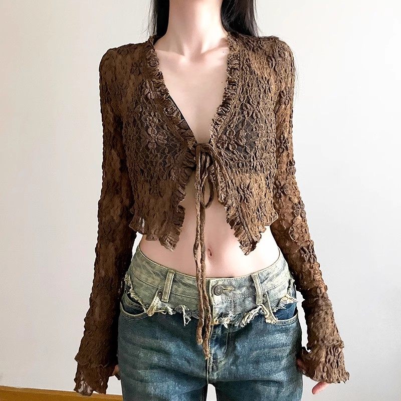 荷叶边系带蕾丝防晒开衫女薄款夏季外搭短款披肩罩衫外套长袖上衣