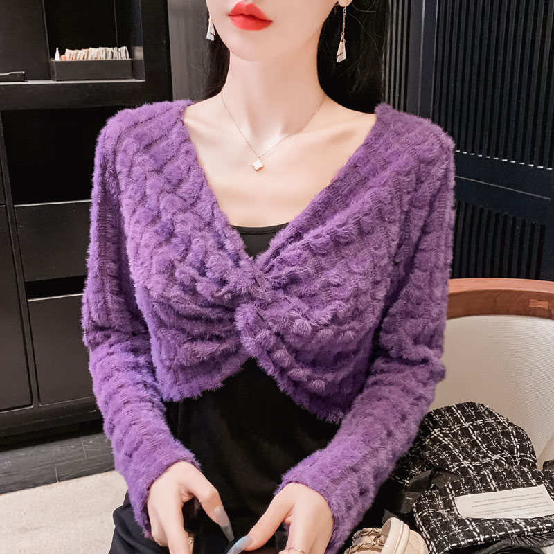 植绒冬季V领蕾丝上衣长袖吊带连衣裙外搭罩衫短外套高级感打底衫