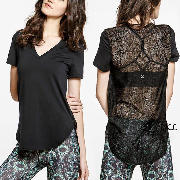 上衣潮韩国大码健身运动速干T恤女V领罩衫 瑜伽服夏蕾丝跑步运动