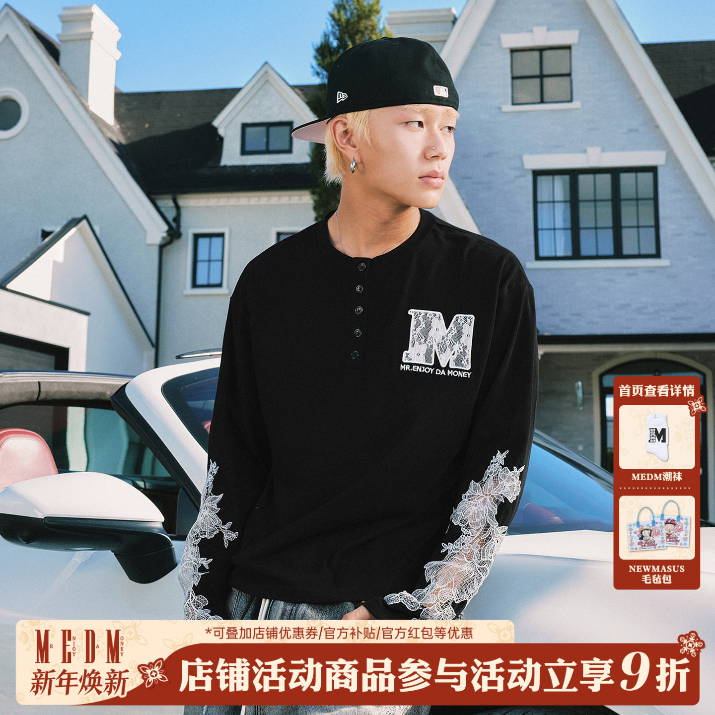 MEDM 蕾丝织纱亨利领罩衫休闲长袖T恤春秋通勤百搭宽松情侣上衣