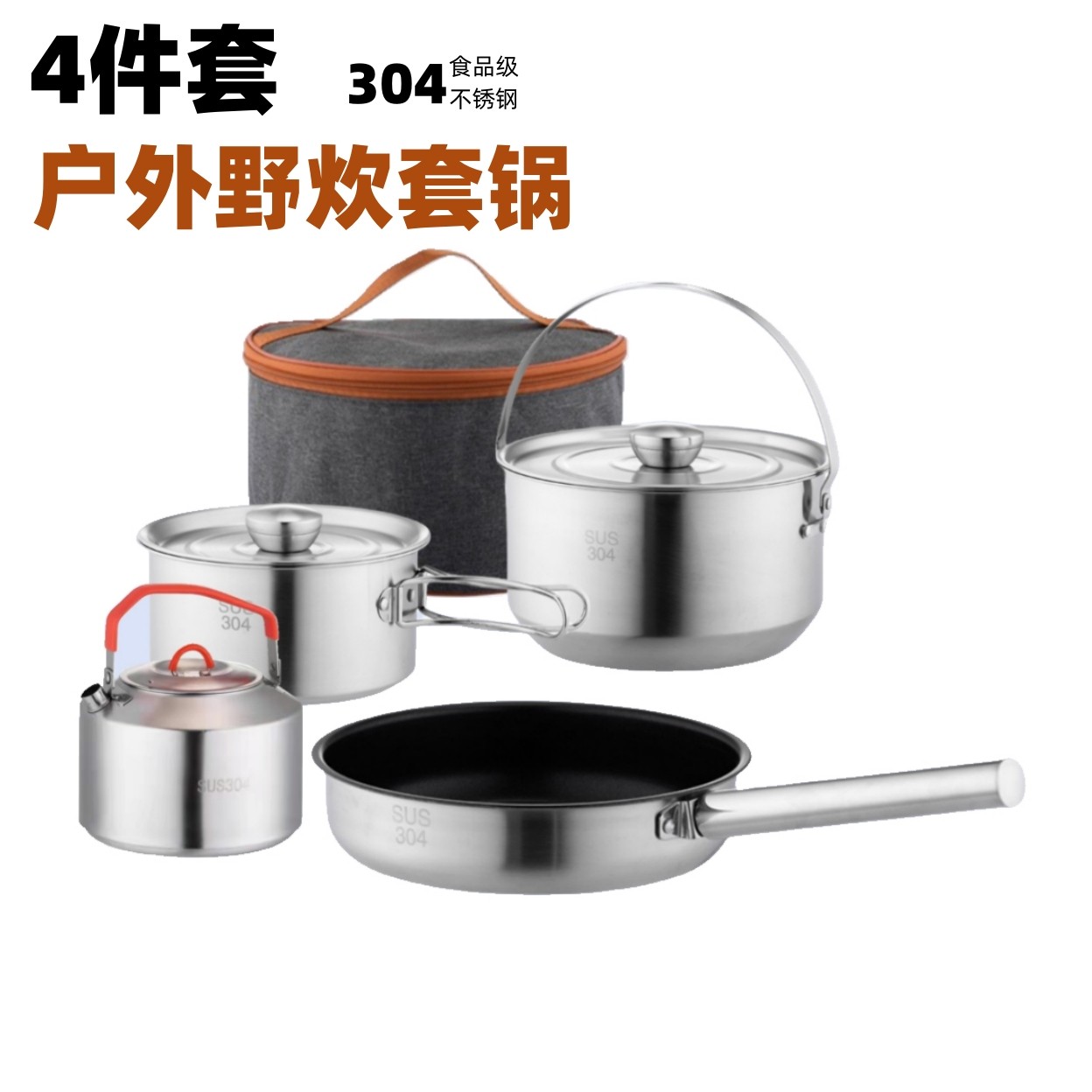 户外套锅烧水壶304食品级不锈钢露营野餐锅具便携式2-8人锅四件套