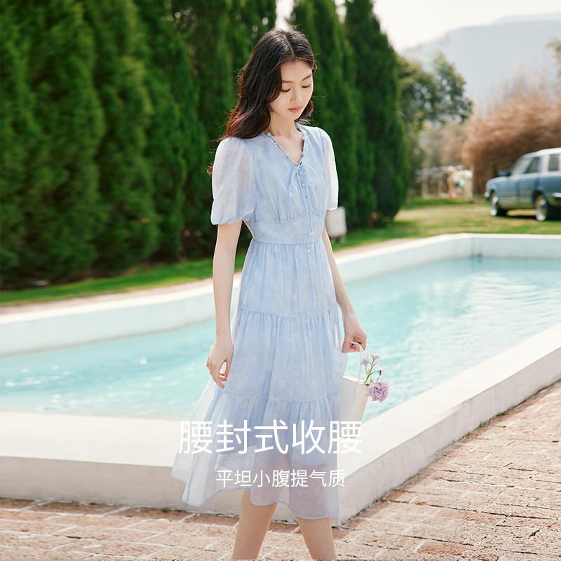 香影天蓝色泡泡袖连衣裙女2025夏装新款收腰小清新欧若风v领裙子