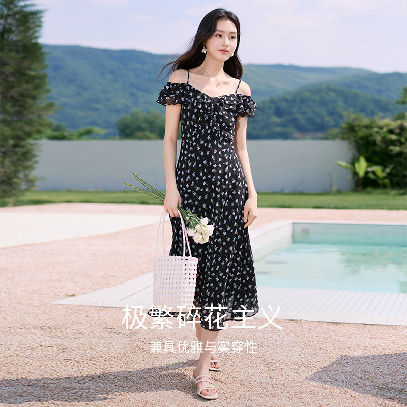 香影度假风吊带露肩连衣裙女2025夏季新款一字领黑色碎花雪纺裙子