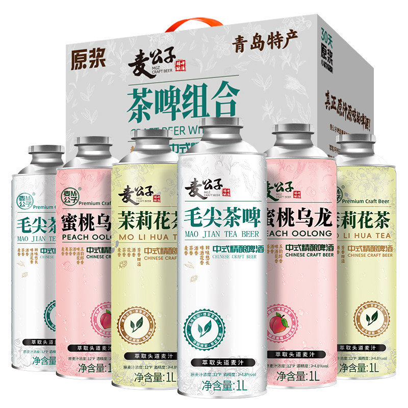 青岛特产精酿原浆啤酒1L*6整箱装毛尖茶啤蜜桃乌龙茉莉花茶组合装