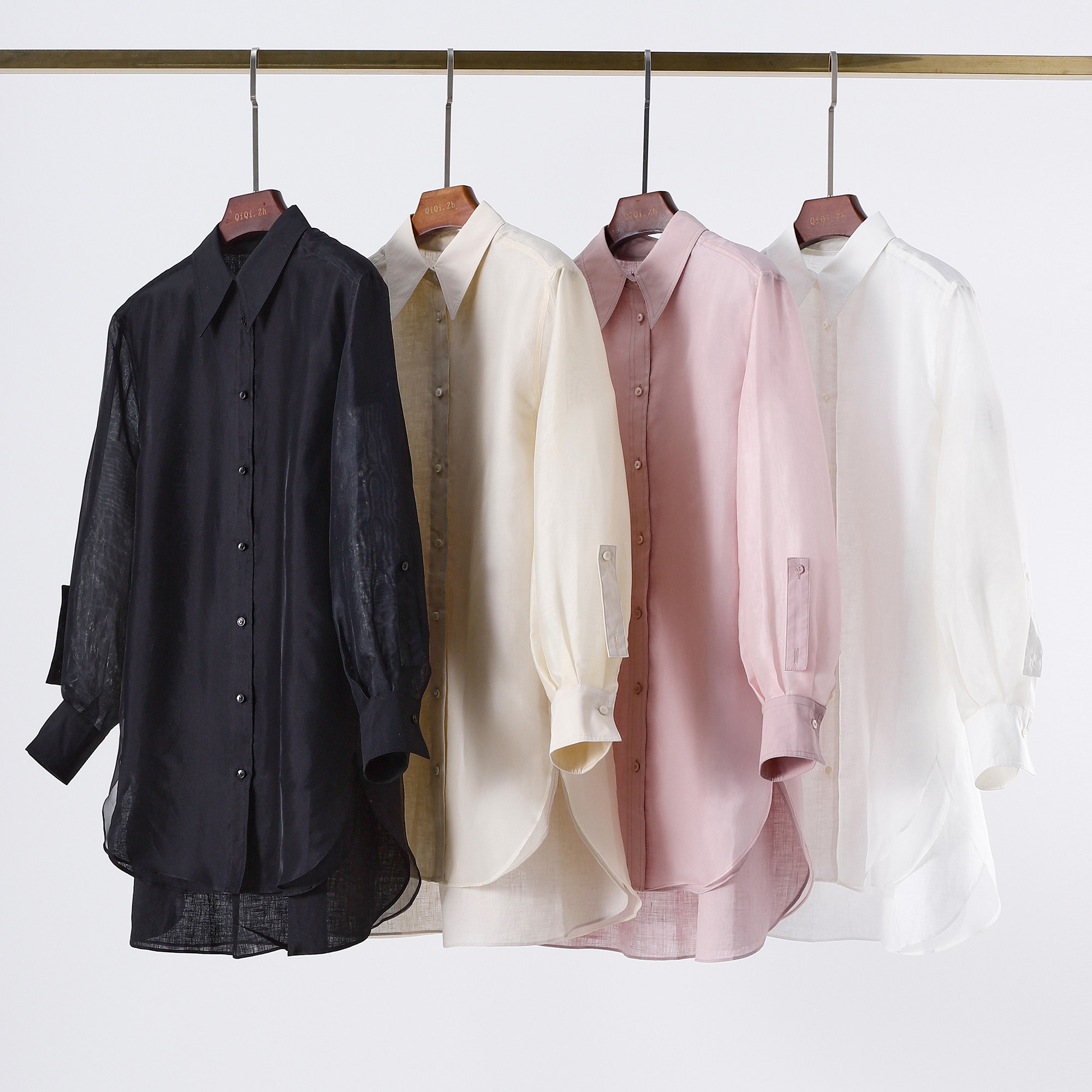 格调好货 真丝欧根纱+亚麻双面穿双层翻领宽松衬衫 休闲上衣女