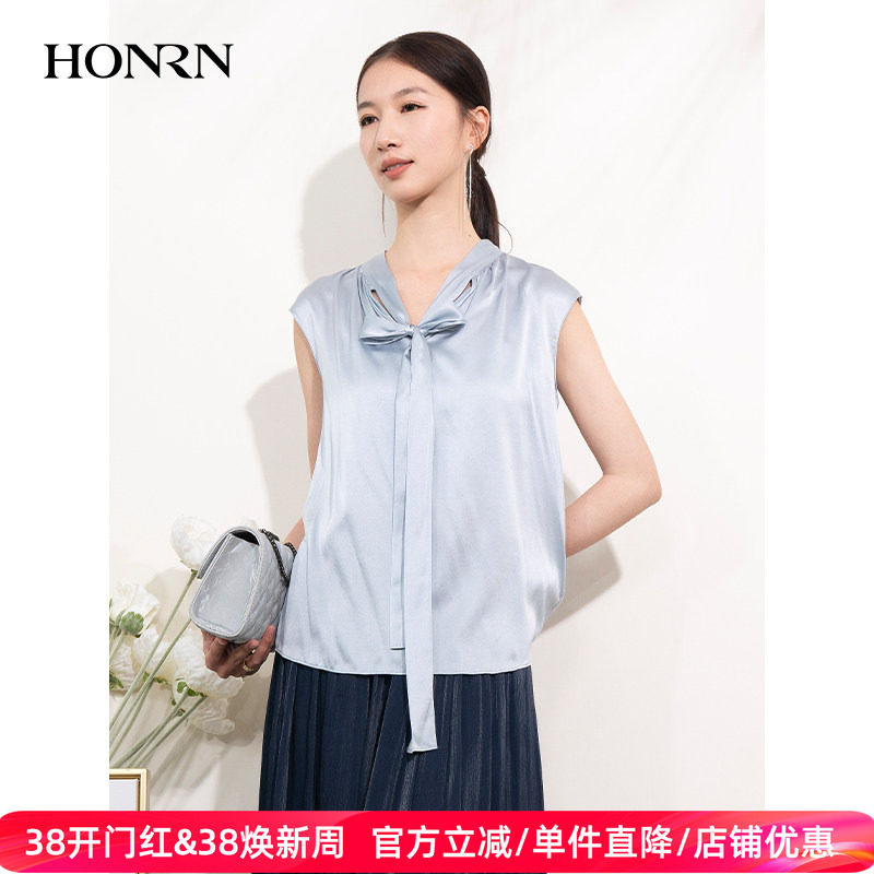 HONRN/红人宽松蓝色薄款桑蚕丝真丝v领系带衬衫女上衣夏HI22SY609