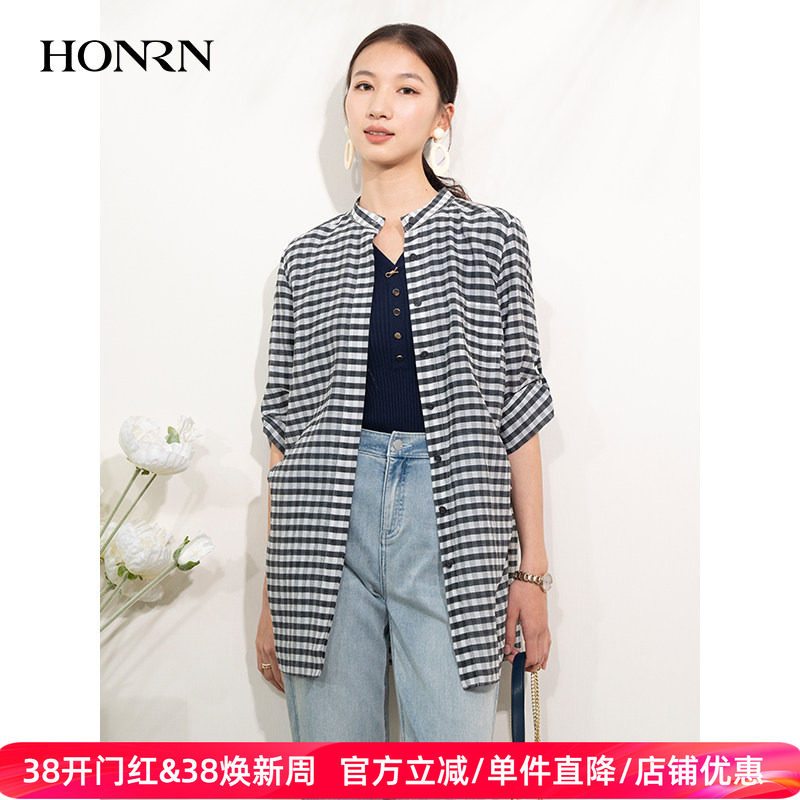 HONRN/红人宽松休闲桑蚕真丝棉格子立领衬衫女上衣夏季HI22OC510
