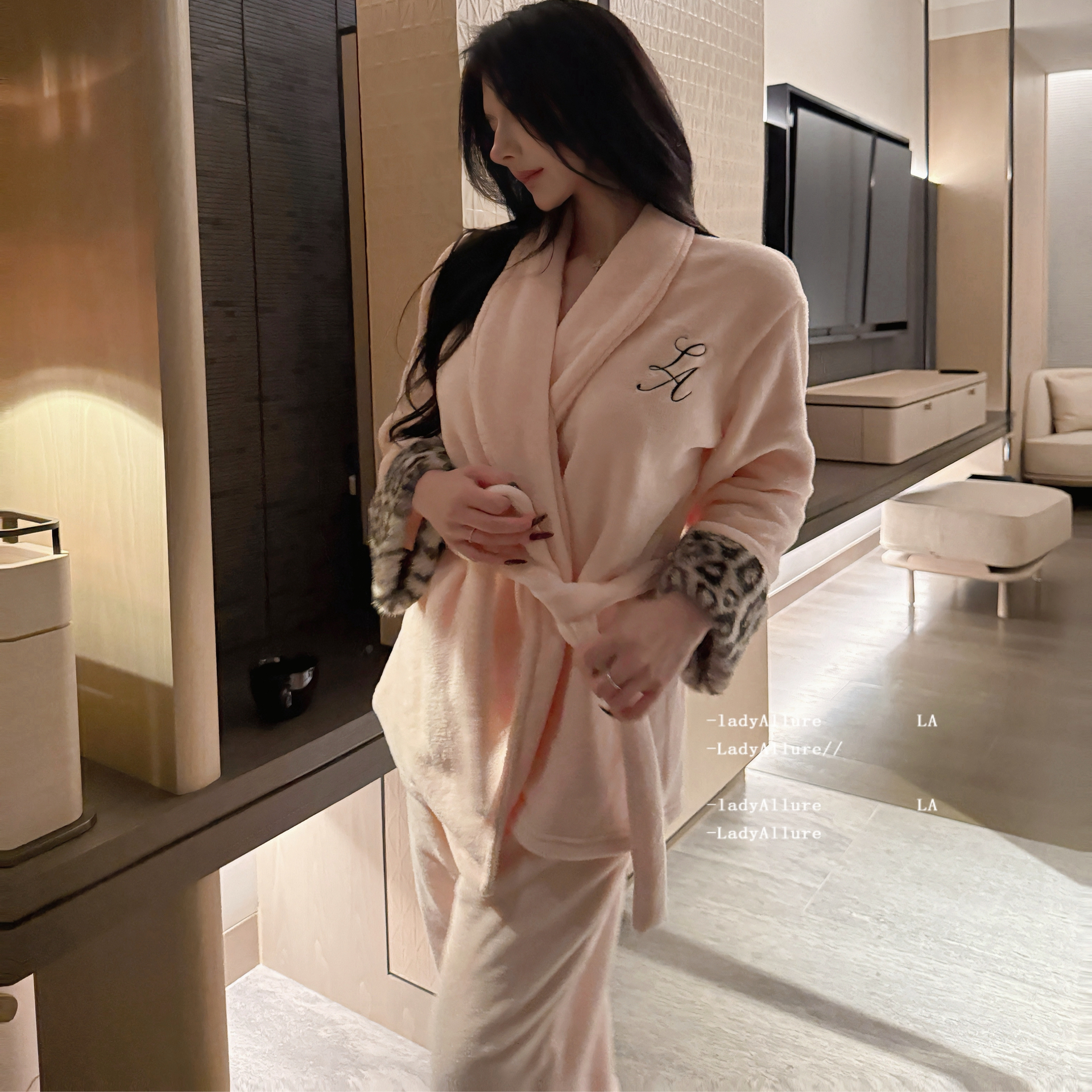 微醺小姐家居服三件套装24年秋冬季新款睡袍半边绒珊瑚绒睡衣女士