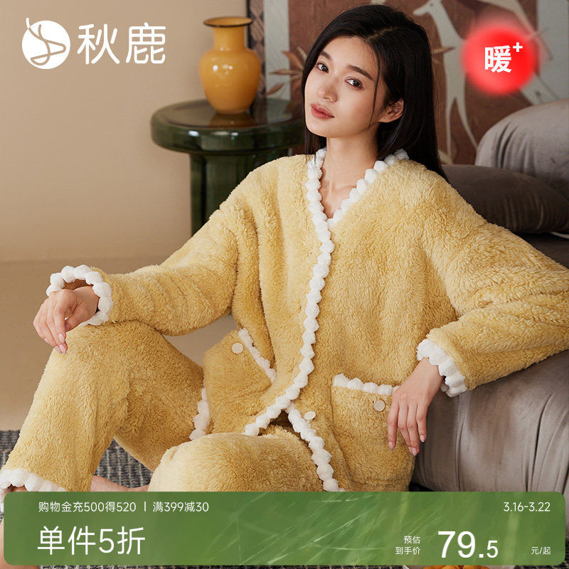 秋鹿珊瑚绒睡衣女秋冬新款V领开衫加绒加厚保暖家居服可外穿套装