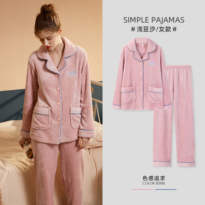 QS【情侣款】睡衣冬季珊瑚绒加厚加绒长袖宽松家居服翻领德绒套装