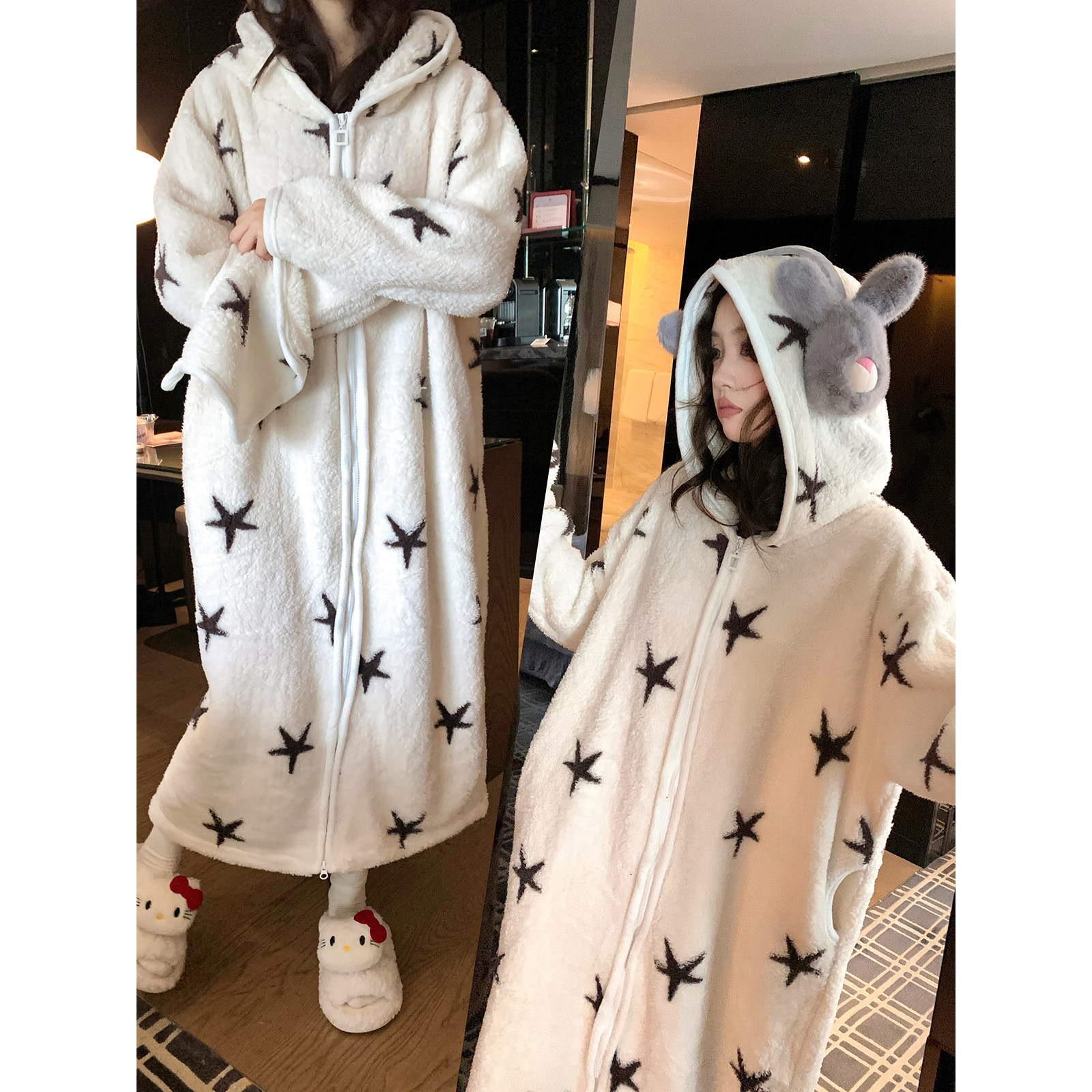 馨帮帮Homedress 星星印花连帽珊瑚绒睡衣冬保暖加厚家居服睡袍女