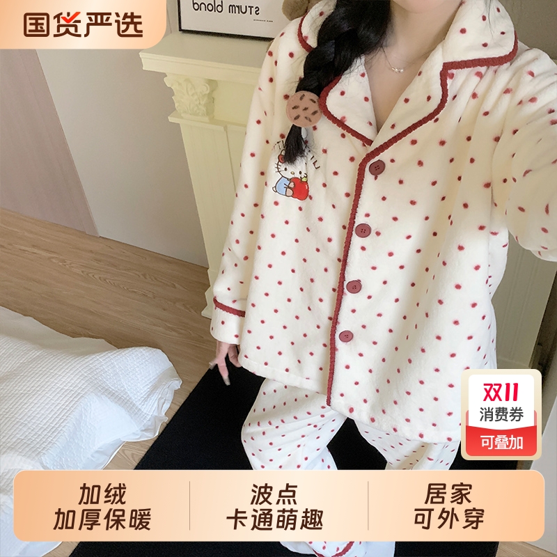 卡通kt猫珊瑚绒睡衣女秋冬款加绒加厚网红风学生大码法兰绒家居服