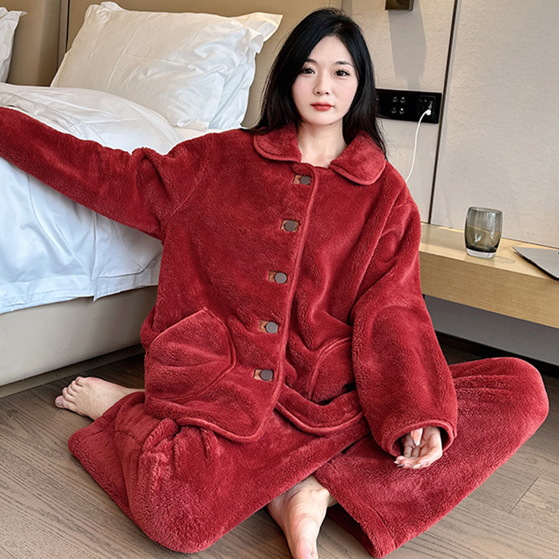 红豆女士珊瑚绒睡衣加厚抗静电开衫桂花绒保暖家居服可外穿套装25