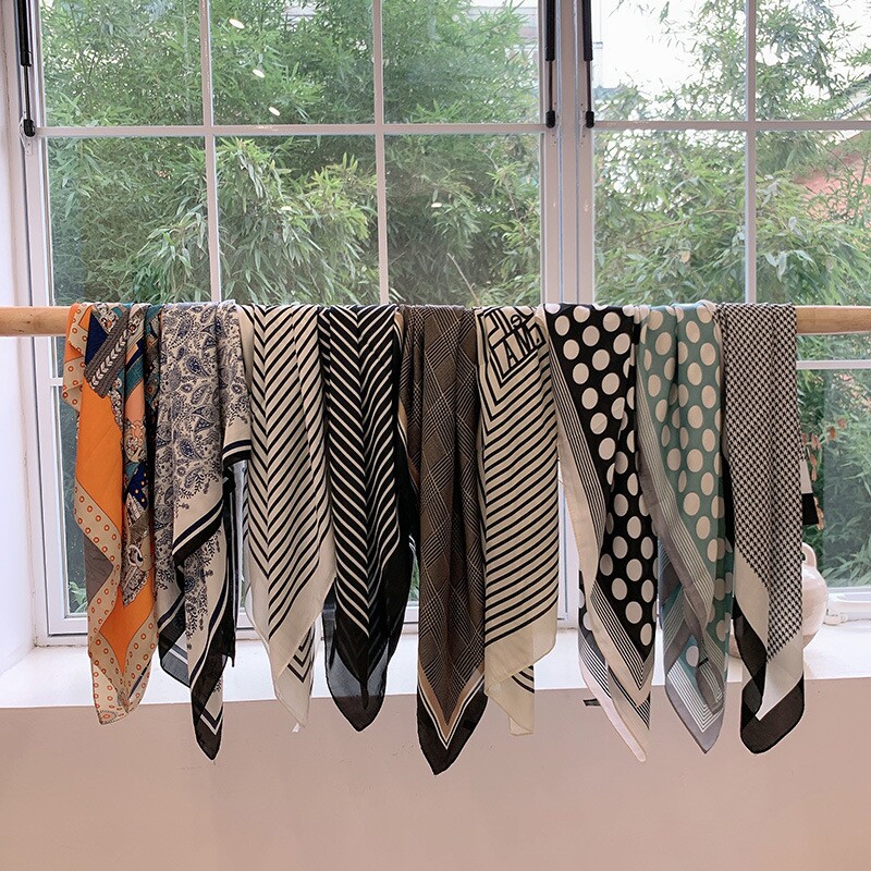 法式缎面围巾气质小方巾黑白经典复古丝巾系脖高级感网红同款领巾