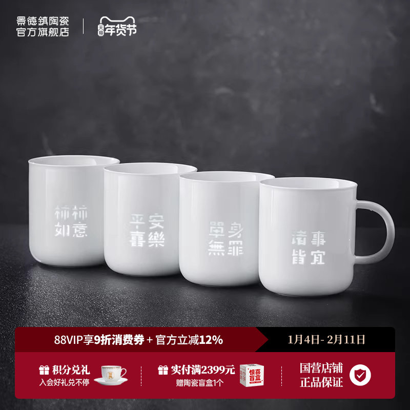 景德镇官方陶瓷玲珑家用高温白瓷办公泡茶杯中式大容量马克杯水杯