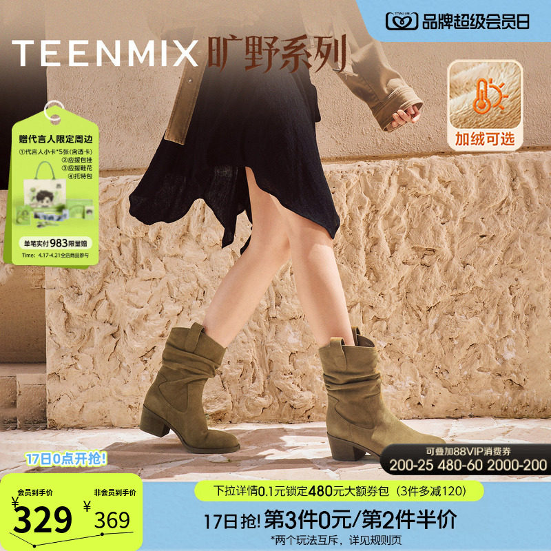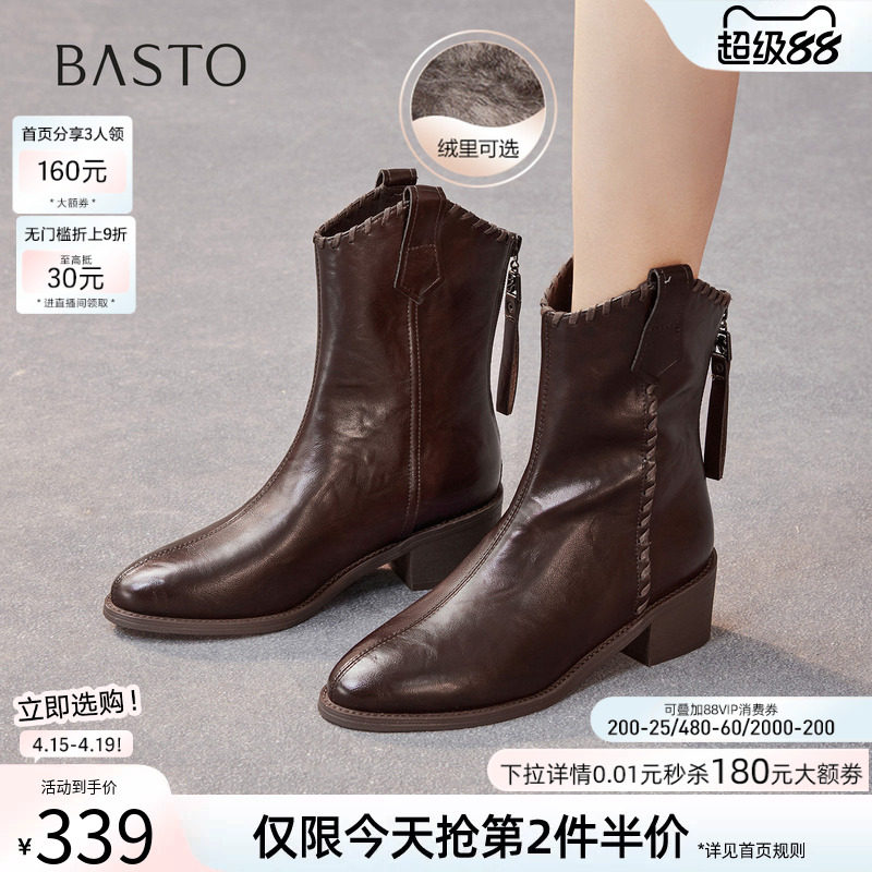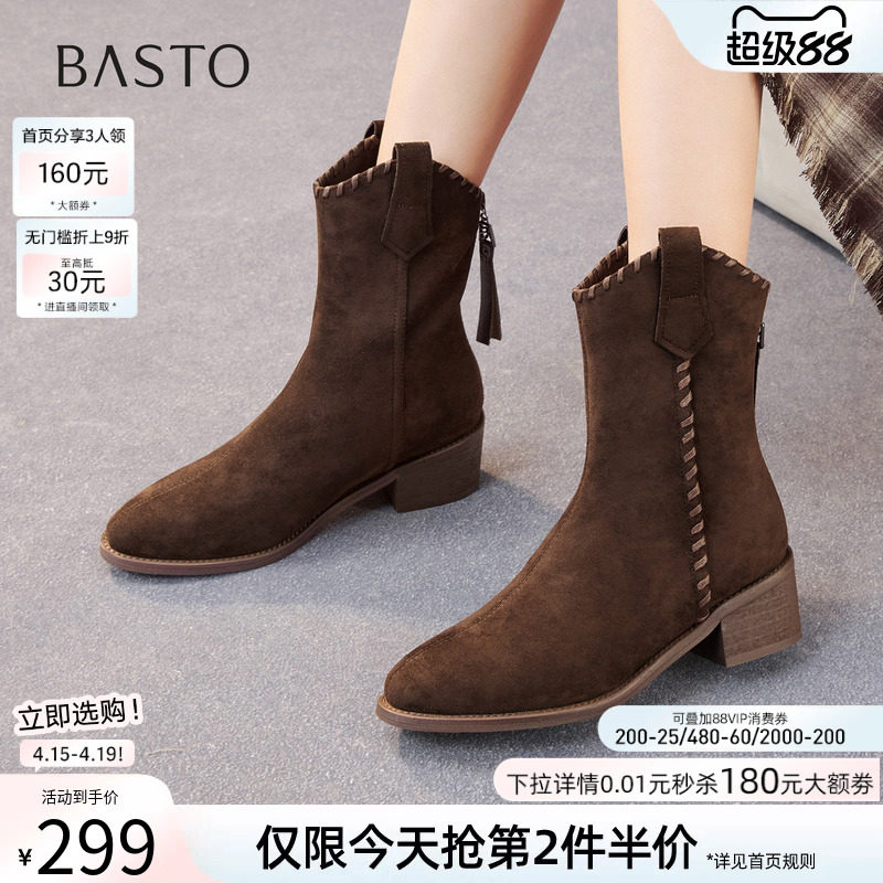星期六粗跟短靴女款2025新款冬季加绒英伦风方头堆堆靴百搭西部靴