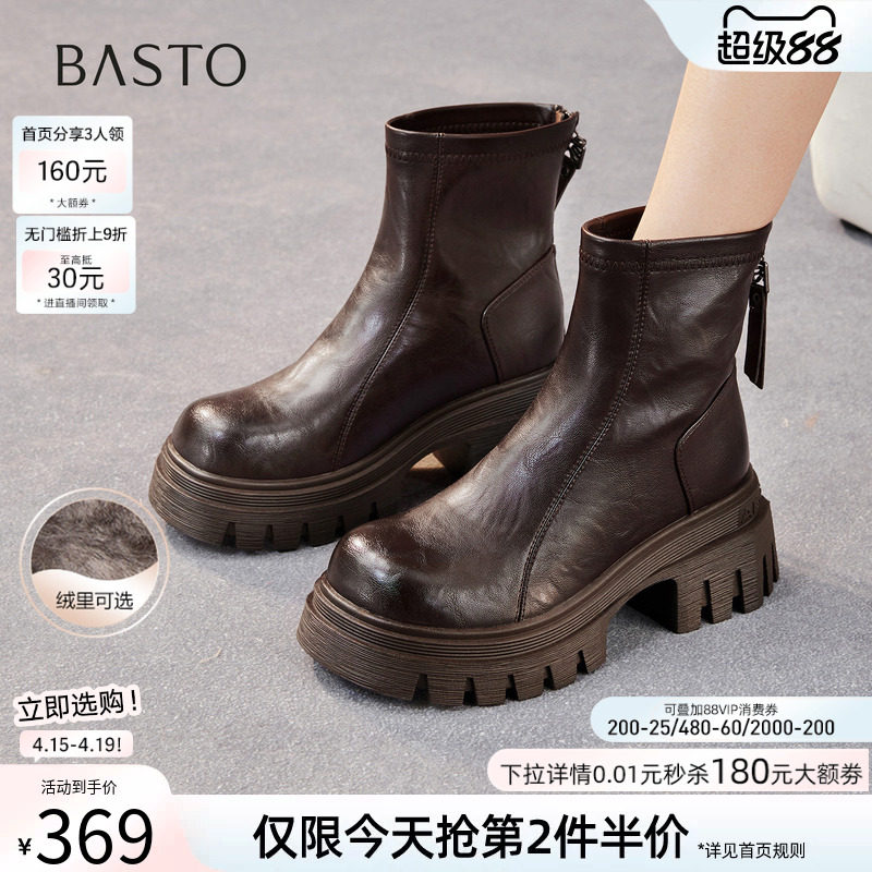 百丽复古加绒弹力靴女冬季新款厚底粗跟显瘦瘦靴短靴子E5E1DDZ5