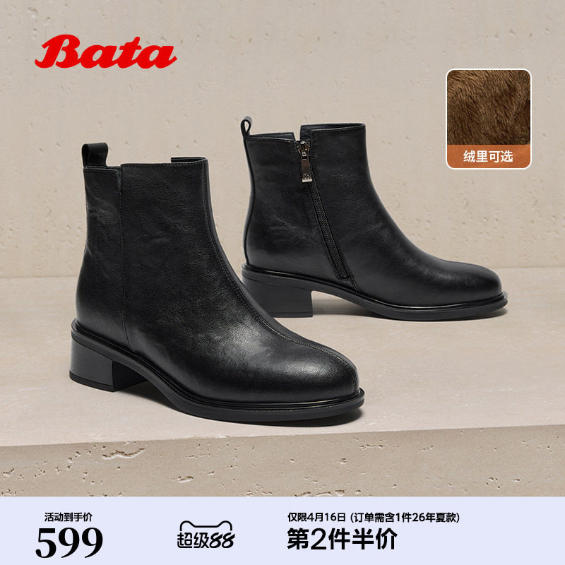 Bata时装靴女冬季商场新款粗跟百搭羊皮加绒短筒靴76180DD5