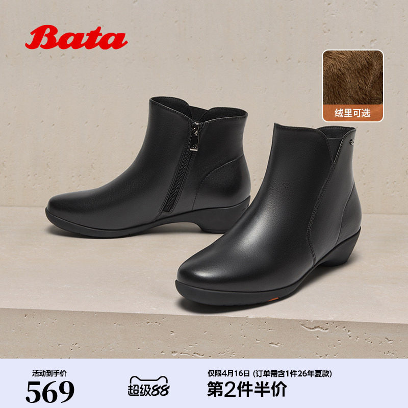 Bata时装靴女冬商场新款软底羊皮通勤粗跟加绒短筒靴AGW40DD5