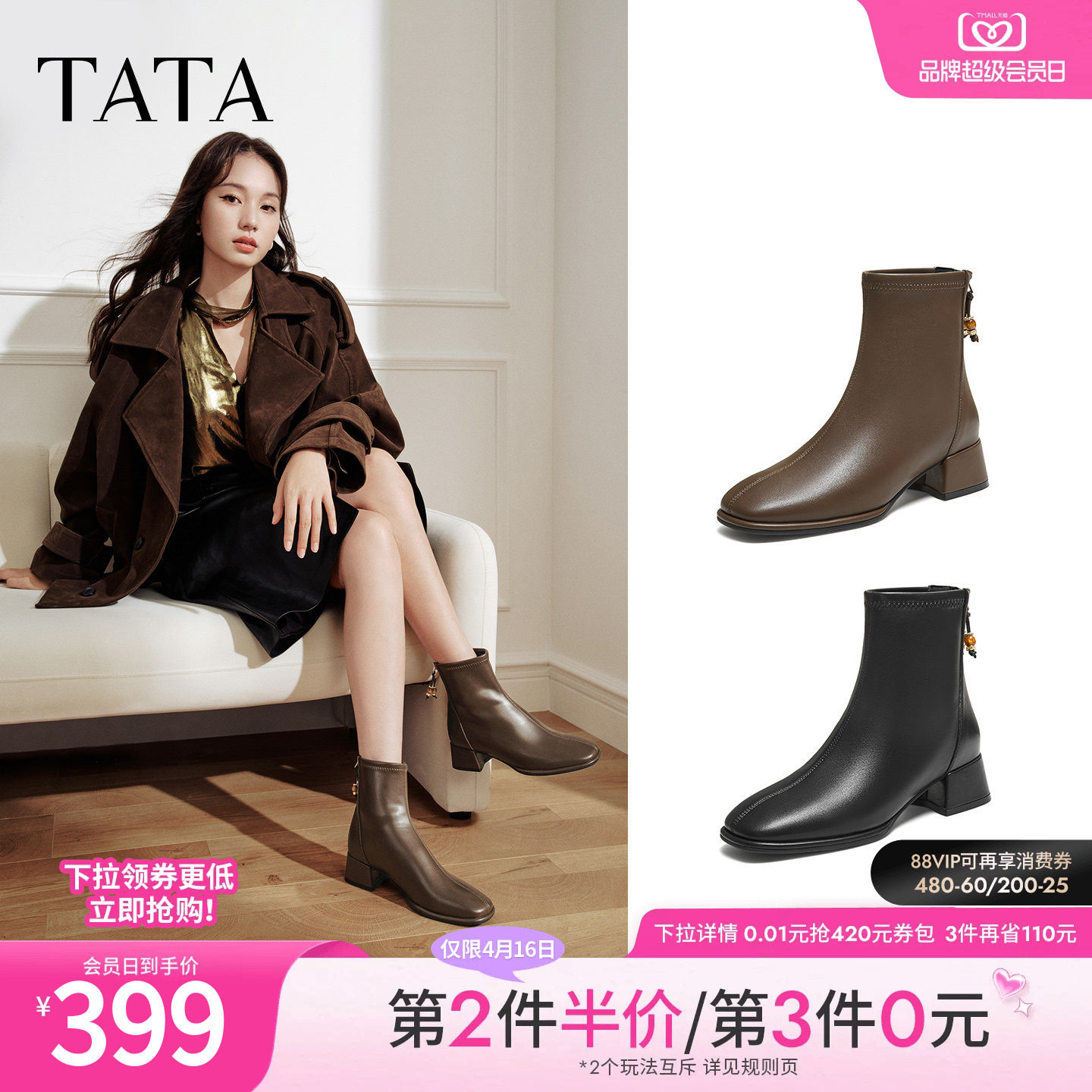TATA他她靴子女冬季新款通勤黑色时装短靴粗跟加绒瘦瘦靴WYX04DD5