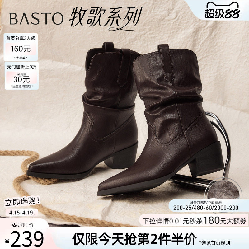星期六复古尖头西部靴女2025春季新款粗跟舒适中筒靴子加绒堆堆靴