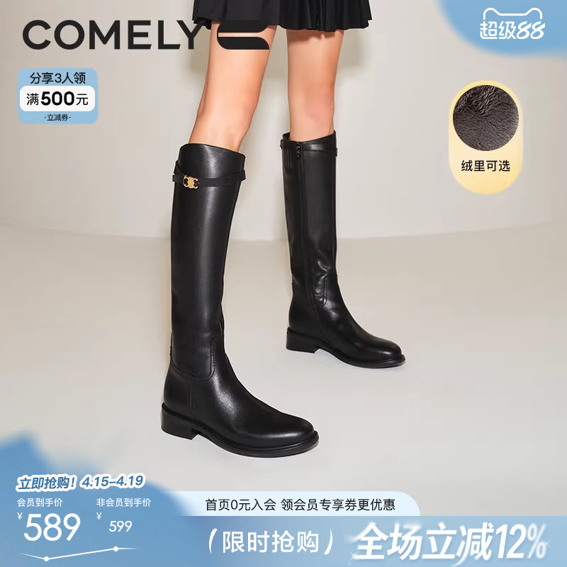 星期六加绒英伦长筒靴女2025秋冬粗跟圆头显瘦高不过膝全牛皮长靴