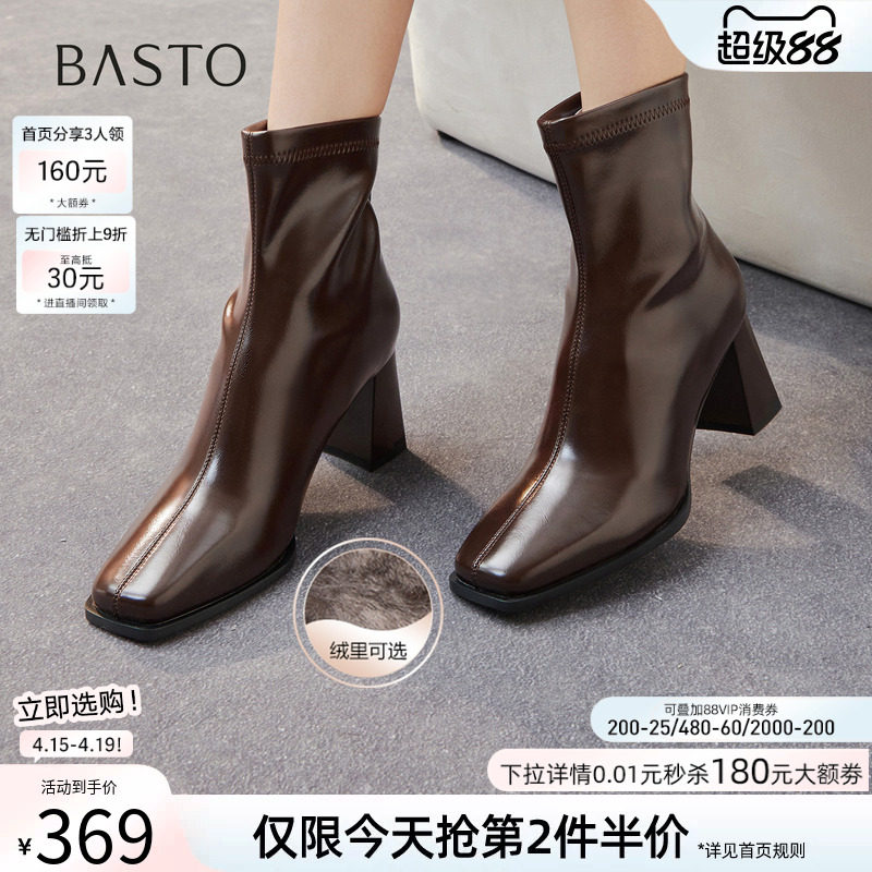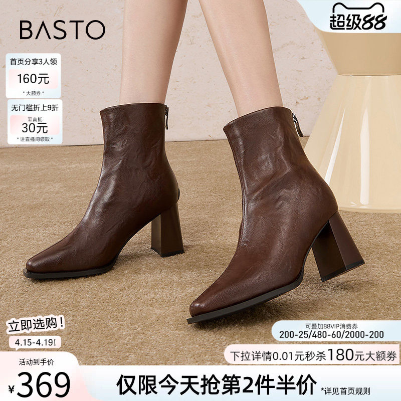百思图冬商场新款气质方头高跟法式小踝靴加绒女短靴B2812DZ5