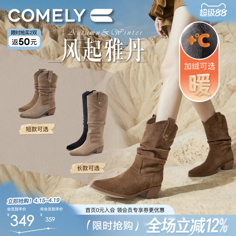 赵露思同款康莉V口尖头堆堆靴冬季新款粗跟加绒西部牛仔靴女短靴