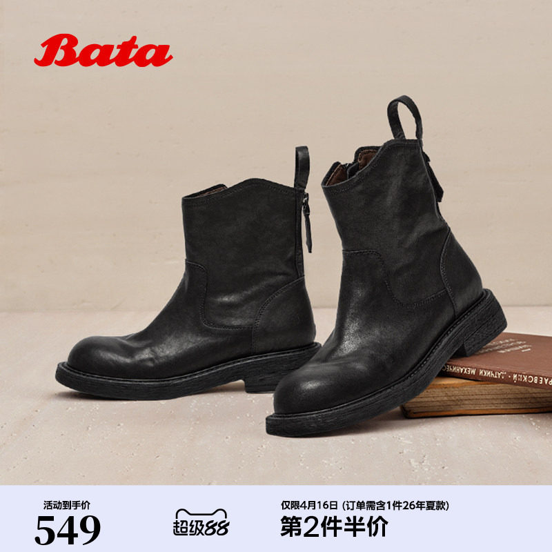Bata时装靴女冬季新款加绒牛皮粗跟通勤百搭柔软靴66051DZ5