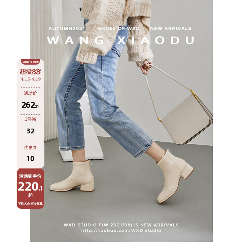 【王小毒】Z时代●真皮及裸袜靴短靴女粗高跟新款方头加绒瘦瘦靴