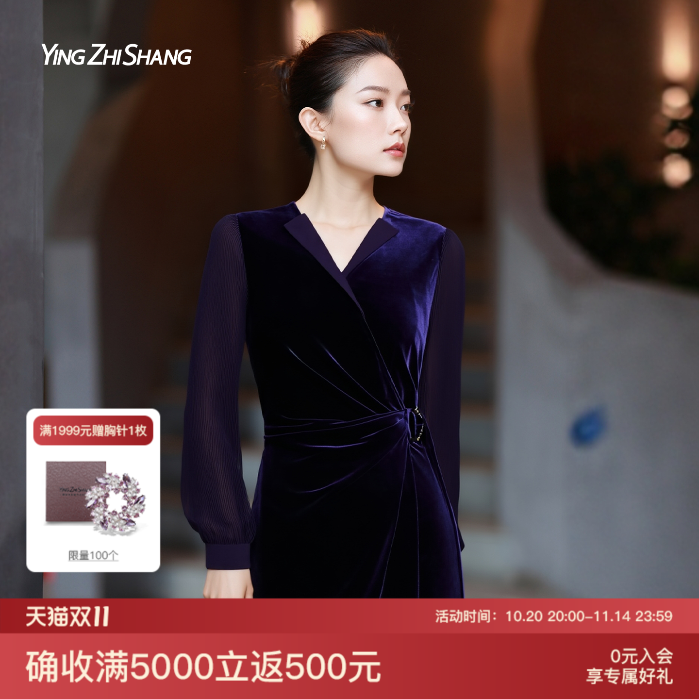 赢智尚丝绒连衣裙秋新款V领收腰轻奢安可拉红气质宴会礼服裙子女
