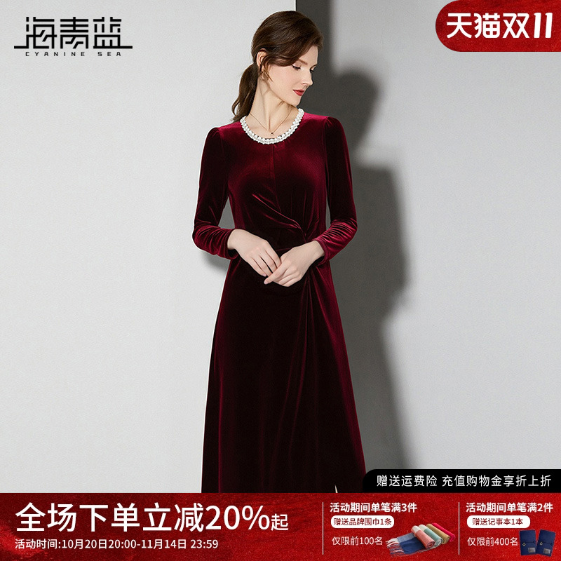 海青蓝 丝绒连衣裙秋冬女2025年新款长袖法式长裙气质高级感裙子